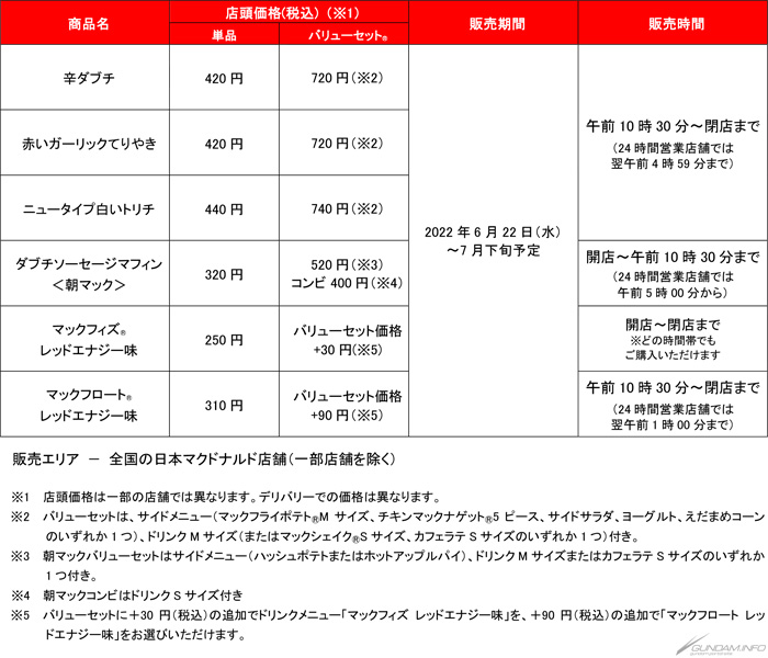 コラボメニューは、昨年好評を博した「辛ダブチ」が期間限定で登場するほか、新発売の「赤いガーリックてりやき」「ニュータイプ白いトリチ」、朝マックの「ダブチソーセージマフィン」、ドリンク「マックフィズⓇ レッドエナジー味」「マックフロートⓇ レッドエナジー味」の計6種。