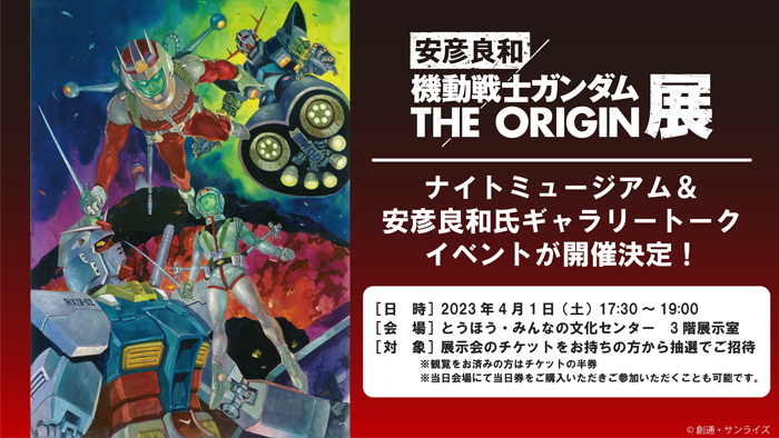 当日は、会場クローズ後にギャラリートークを実施。ゲストに『機動戦士ガンダム THE ORIGIN』安彦良和監督が登場し、福島テレビアナウンサーの日野佑希人さんによる進行のもと、トークを展開する。その後、19:00までナイトミュージアムを楽しむことができる。