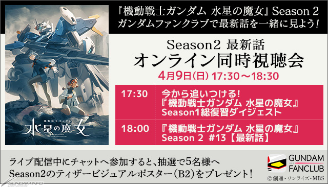 公式アプリ「ガンダムファンクラブ(GFC)」にて、4月9日(日)17:30より『機動戦士ガンダム 水星の魔女』Season2のオンライン同時視聴会が開催される。