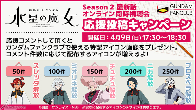 また、GFC内で設定できる特製アイコン画像をプレゼントする「『水星の魔女』アイコン画像プレゼントキャンペーン」も同日より開催。コメント数に応じてアイコン画像が増えるので、奮って参加してみよう。