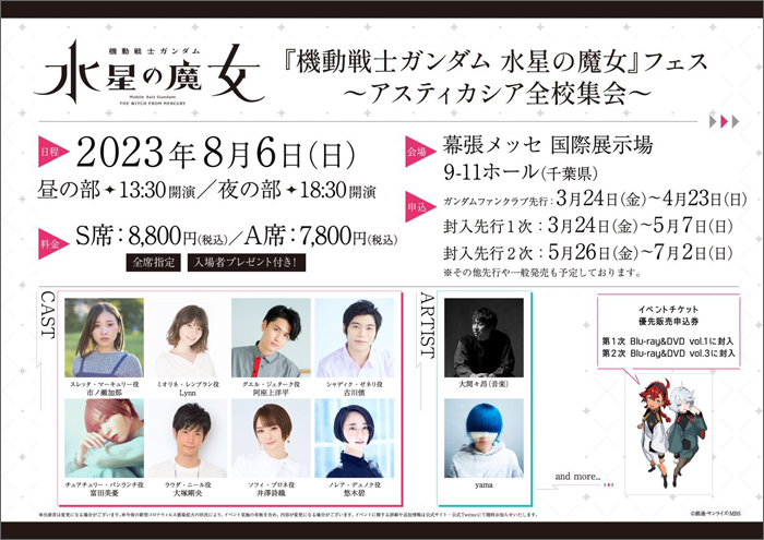 8月6日(日)に千葉・幕張メッセで開催予定の、全席指定の有料イベント「『機動戦士ガンダム 水星の魔女』フェス~アスティカシア全校集会~」の最新情報が公開された。