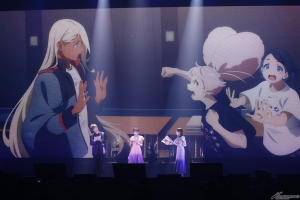 再開された生アフレコの後半パートではスレッタとエリクト、2人の娘によってプロスペラがついにその歩みを止める場面、そして戦いを終え宇宙を漂うスレッタをミオリネが迎えに来る場面などの終盤の名シーンが披露されると、最終回で起用された挿入歌「宝石の日々」を歌うアイナ・ジ・エンドさんが再び登場し、オーケストラの生演奏とともに、優しい歌声で会場を包み込み、生アフレコは幕を閉じた。