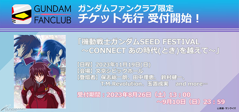 メモリアルイベント「機動戦士ガンダムSEED FESTIVAL ~CONNECT あの時代(とき)を越えて~」のチケット「ガンダムファンクラブ会員先行」(抽選)の申込受付が、本日8月26日(土)にスタートした。全席指定、価格は9,800円(税込)。