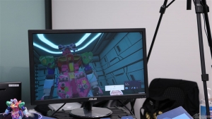 VR空間で最初に移動する部屋では、窓の外から地球を見下ろせたり、飾らされたガンプラを見たりもできる。