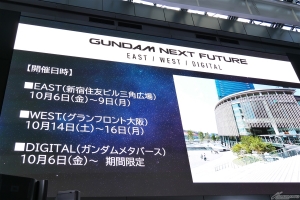 「GUNDAM NEXT FUTURE -EAST-」は、10月9日(月・祝)まで好評開催中。来週10月14日(土)から16日(月)までは、グランフロント大阪で「GUNDAM NEXT FUTURE -WEST-」も開催される。いずれも入場無料。