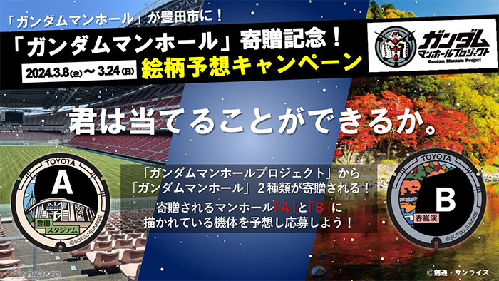 「ガンダムマンホールプロジェクト」より、愛知県豊田市に2枚の「ガンダムマンホール」が寄贈されることが決定した。設置は4月11日(木)予定。