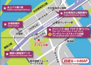 臨海副都心内の潮風公園展望デッキ、水上バス乗り場、お台場海浜公園駅ほかのスポット計6カ所をまわり、各所で台紙にスタンプを重ね捺しすると、実物大ユニコーンガンダム立像のビジュアルが完成する。