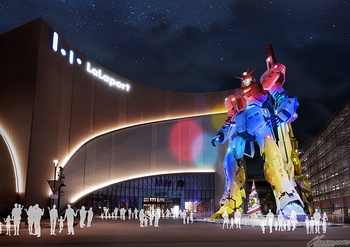 今回は、今年迎えた「ガンダムシリーズ」の45周年をテーマに、ガンダムを象徴するトリコロールカラーで立像が照らし出される。
