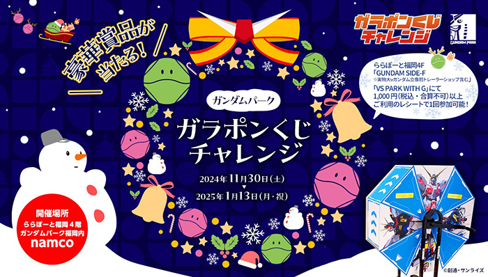 「GUNDAM SIDE-F(※実物大 ν(ニュー)ガンダム立像前トレーラーショップ含む)」と「VS PARK WITH G」にて、1,000円(税込・合算不可)以上の利用レシートを提示すると、12月25日(水)に開催される「『機動戦士ガンダムSEED FREEDOM』シネマ・コンサートツアー in 福岡 入場者特典付 鑑賞ペアチケット」や「RG 1/144 RX-93ff νガンダム[クリアカラー]」ほか豪華賞品があたるガラポンに参加できる。期間は2025年1月13日(月・祝)まで。