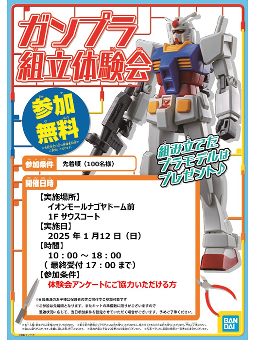 1月12日(日)に愛知・イオンモールナゴヤドーム前の「THE GUNDAM BASE SATELLITE NAGOYA」にて、「ガンプラ組立体験会」が開催される。