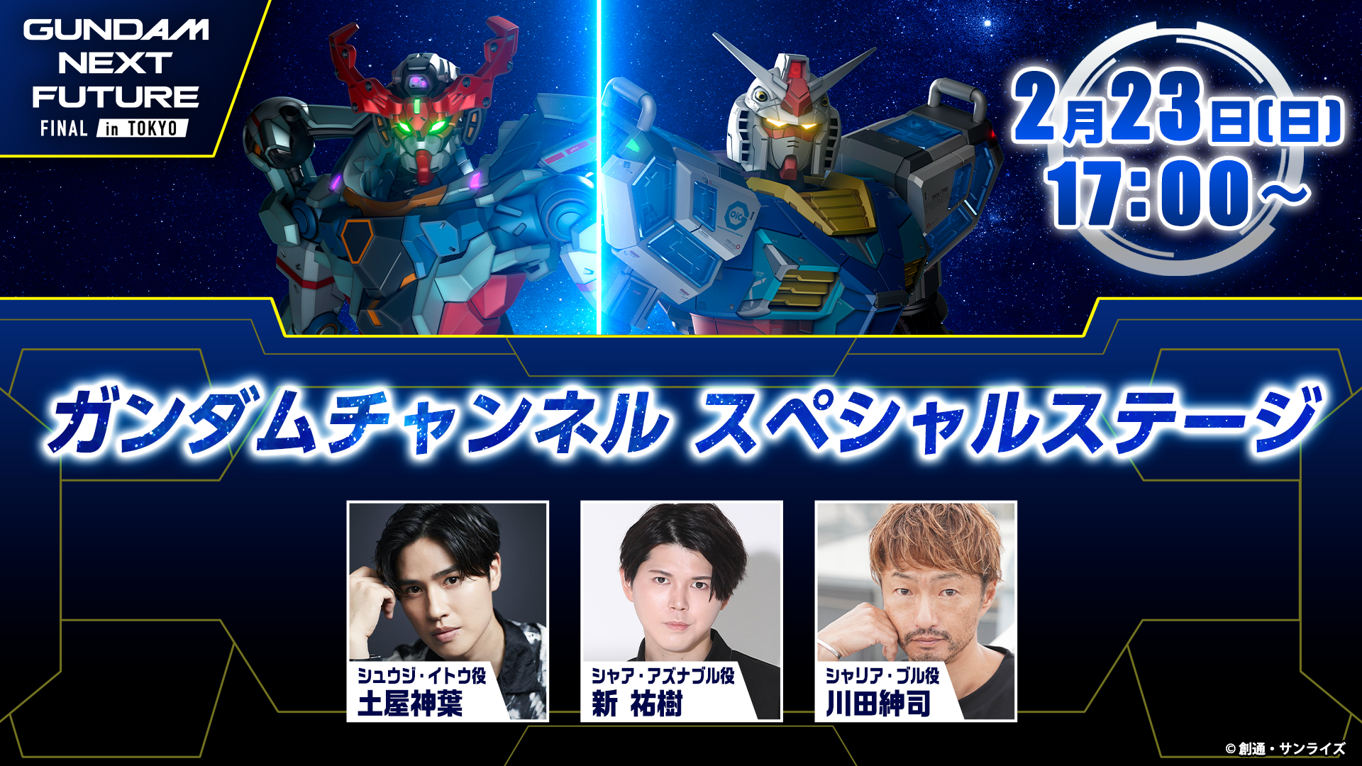 好評開催中の大型イベント「GUNDAM NEXT FUTURE -FINAL-」東京会場にて実施された「ガンダムチャンネル スペシャルステージ」にて、『機動戦士Gundam GQuuuuuuX -Beginning-』よりシュウジ・イトウ役の土屋神葉さん、シャア・アズナブル役の新 祐樹さん、シャリア・ブル役の川田紳司さんが登壇し、ガンダムシリーズのイチオシ情報をお届けする番組「Gundam Updates(ガンダムアップデート)」を生配信。