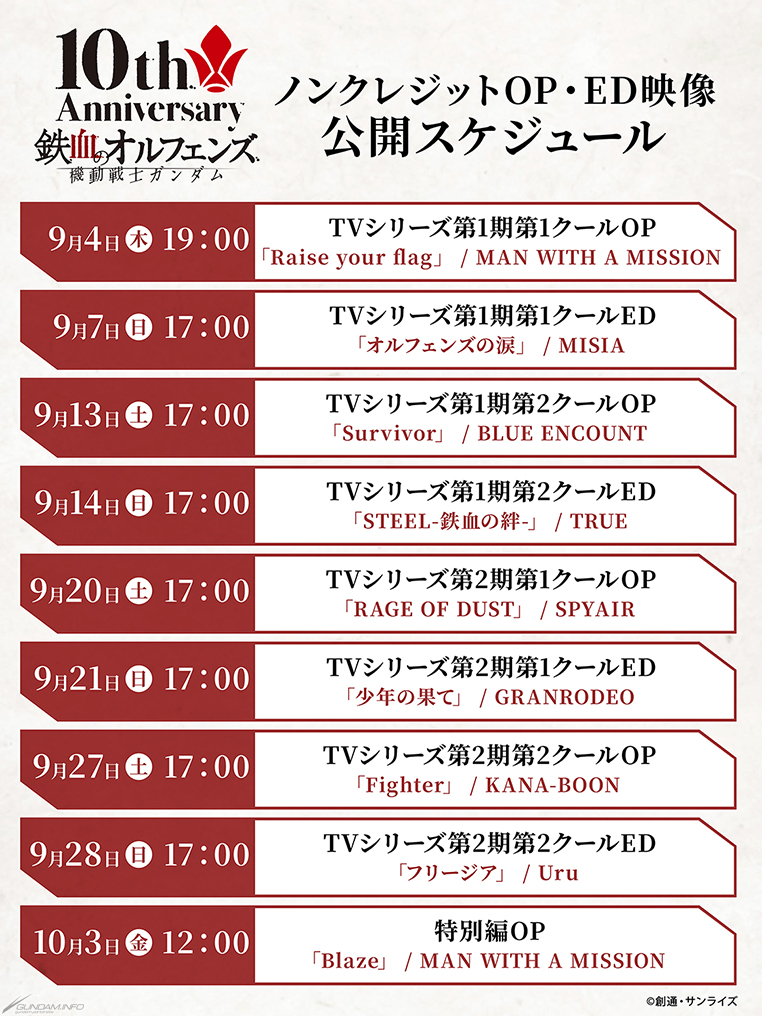 このほか、ノンクレジットOP&ED映像公開企画もスタートしており、全9本のOP・EDムービーが、本日よりYouTube ガンダムチャンネル、『鉄血のオルフェンズ』シリーズ公式Xにて順次公開される。こちらもあわせてチェックしよう。