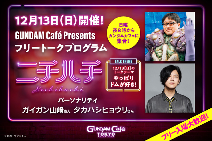 体験型エンターテインメントレストラン施設「GUNDAM Café TOKYO BRAND CORE(ガンダムカフェTOKYO)」では、フリートークプログラム 「ニチハチ」が、12月13日(日)20:00より開催されることが決定した。