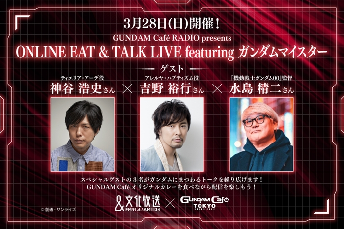 「GUNDAM Café TOKYO BRAND CORE」と「文化放送」による生放送特別番組「GUNDAM Café RADIO presents ONLINE EAT&TALK LIVE featuring ガンダムマイスター」が、3月28日(日)にPIA LIVE STREAMにて有料生配信されることが決定した。