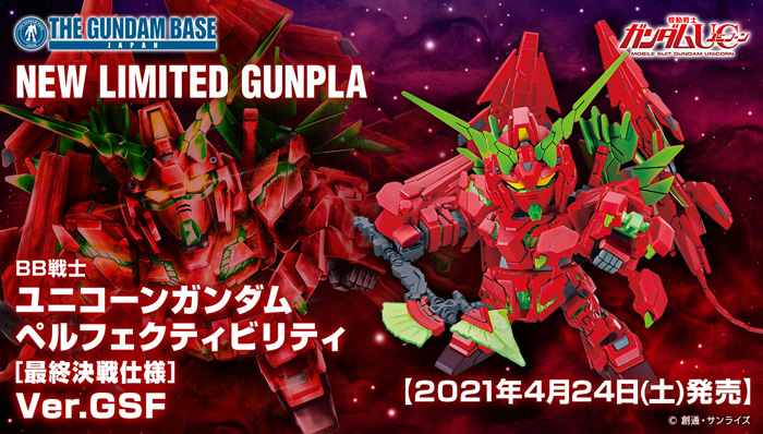 ガンプラ総合施設「THE GUNDAM BASE FUKUOKA」(ガンダムベース福岡)では、ガンダムベース福岡限定品「HG ユニコーンガンダム ペルフェクティビリティ(デストロイモード)(最終決戦仕様)Ver.GSF」と「BB戦士 ユニコーンガンダム ペルフェクティビリティ(最終決戦仕様)Ver.GSF」が、本日4月24日(土)に発売される。