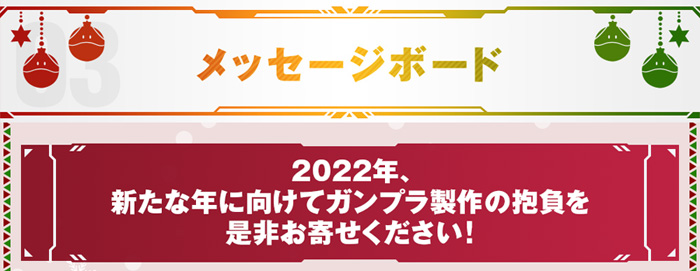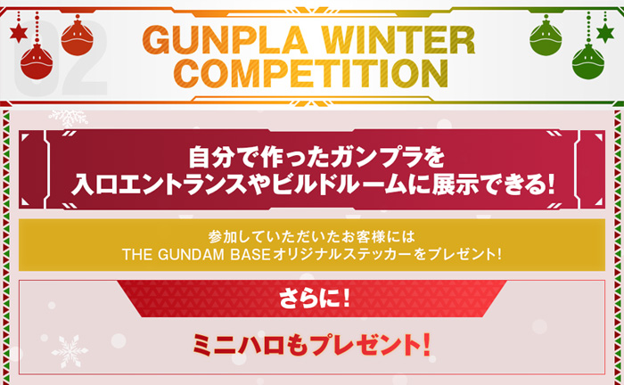 本イベントは、「ガンプラ組立体験会」と「GUNPLA WINTER COMPETITION」、「メッセージボード」を実施する。イベント期間中、参加者にはプレゼントも用意されているので、ぜひチェックしておこう。