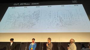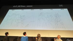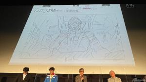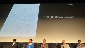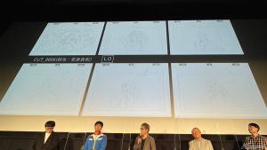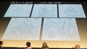 イベントの終盤には、画面の構成を指示する「レイアウト」や「原画」といった貴重な制作資料がスクリーンに投影されたが、トークが盛り上がり過ぎたためあえなく時間切れ。最後に田村 淳さんと安彦監督よりコメントがあり、大盛り上がりとなったイベントは幕を閉じた。