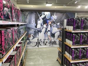 『機動戦士ガンダム 水星の魔女』の作品展示や新作アイテムに加え、主人公スレッタ・マーキュリーが搭乗するガンダム・エアリアルの全高約2mの立像を展示。また、『水星の魔女』アニメ本編の前日譚「PROLOGUE」の“オンライン試写会参加チケット”が封入されたリーフレットを配布する。