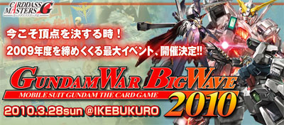 対戦型トレーディングカードゲーム「ガンダムウォー」の、2009年度を締めくくるビッグイベント『ガンダムウォー BIGWAVE2010』が、3月28日(日)に池袋サンシャインシティ 文化会館ホールCにて開催される。