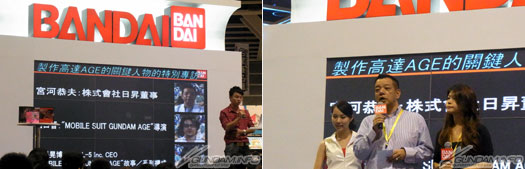 ブース内ステージで「ガンダムAGE」の最新PVが上映されると多くの来場者が詰めかけ、その映像に見入っていた。上映後は本作のエグゼクティブプロデューサー・宮河氏が登壇し、作品のポイントなどを紹介しながら「ガンダムAGE」をPR。最新情報を手に入れようとブースには多くの人があふれていた。