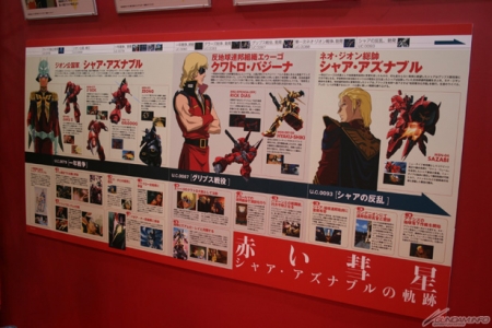 赤一色のトヨタブースでは、このほかシャアの軌跡を紹介する年表や、シャアが残した数々の名言を掲載したパネル、シャアの歴代搭乗機のガンプラ、シャアの設定画レプリカなどが展示され、まさにシャア尽くし。