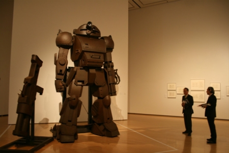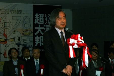 メカデザイナーという仕事に携わるきっかけについて大河原氏は、実は結婚式までに何か仕事に就かなくてはと探し回っているところに、通いやすい場所に仕事場があったことからだと冗談交じりに語り、さらに今回、自分の40年間の仕事がいつものイベントのような形でなく、アカデミックな雰囲気で展示されることについて喜びの言葉を述べた。