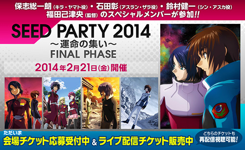 2月21日(金)に東京・お台場「ガンダムフロント東京」で開催される「SEED PARTY 2014 ~運命の集い~ FINAL PHASE」の会場チケットの第2次応募受付が、本日1月20日(月)よりスタートした。