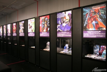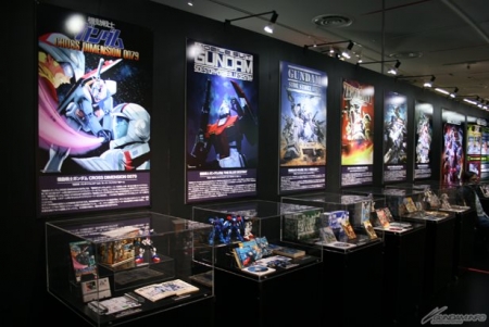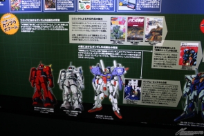▲様々な媒体で展開されたガンダム作品が勢ぞろい。発売された書籍や関連ガンプラを作品別に展示!