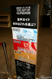 ▲展示作品をより一層楽しむための音声ガイドは、アムロ役の古谷 徹氏による「白の章」、シャア役の池田秀一氏による「赤の章」、ミライ役の白石冬美さんによる「黄の章」の全3種が用意されている。