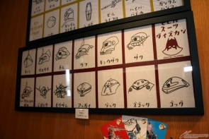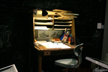 ▲当時の富野監督の机を再現した展示では、俗に“富野メモ”とも呼ばれる、富野監督自ら描いたモビルスーツやキャラクターが壁面に配置されている。
