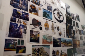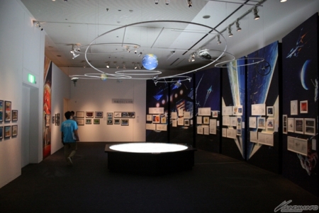 ▲中村光毅氏が描く『機動戦士ガンダム』の美術ボードの数々も。さらに、天井には地球とコロニーの位置関係がわかりやすく立体化された模型が展示されている。
