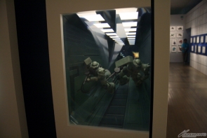 ▲左右の壁に所狭しと展示される、連邦軍・ジオン公国軍それぞれのMSの設定線画に加え、ガラスのゆがみを利用した迫力のジオラマも展示されるなど、“モビルスーツ”の魅力を存分に堪能することができる。