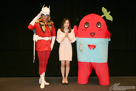 会見では『ガンダムTHE ORIGIN』本編が上映されたほか、ゲストを交えてのクロストークも実施。クロストークは、シャアのものまねでおなじみの芸人・ぬまっちがMCを務め、ゲストとしてアルテイシア・ソム・ダイクン役の潘 めぐみさんが登場したほか、今日だけの特別な「赤いふなっしー」が応援に駆けつけた。