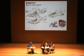 今回で3回目となる同サミットでは、同市在住の大河原邦男さんがホストを務め、ゲストにビジョンクリエイターの河森正治さん、司会進行にアニメ・特撮研究家の氷川竜介さんを迎えてトークショーは始まった。大河原さんと河森さんがいっしょになってトークショーに参加するのは初めてで、会うのも十数年ぶり。打ち合わせで河森さんが大河原さんのご自宅にうかがった際、立派な工房を見てとてもうらやましく思ったとか。