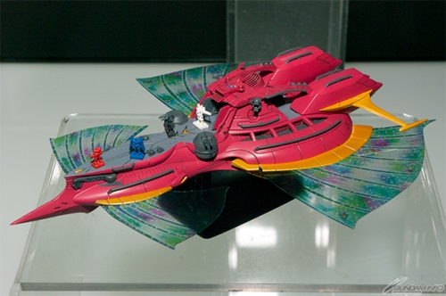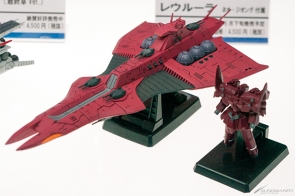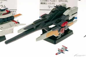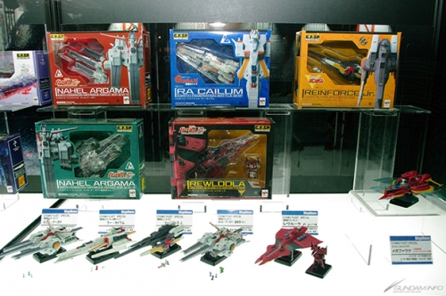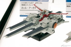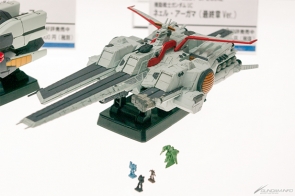 会場では、「コスモフリートスペシャル」のガンダムシリーズ登場艦5隻が全て展示されていたのに加え、7月発売予定の「メガファウナ」が初回特典のクリアシート製フィンを装着した状態で登場。