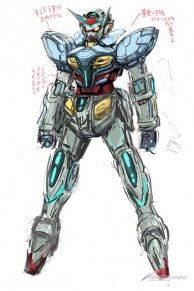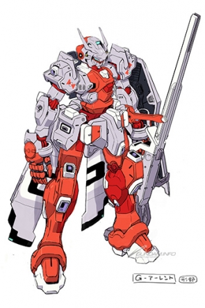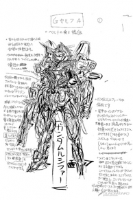 形部氏はお気に入りのモビルスーツとして「G-アルケイン」を挙げ、そのデザインについて『ガンダムを描けることが嬉しくて武装もモリモリ描いた』と語る。アイーダの乗機ということで「もっと女性的に」とオーダーがあった際には色々と試行錯誤し、中には「やり過ぎ」と言われてボツになったデザインも。