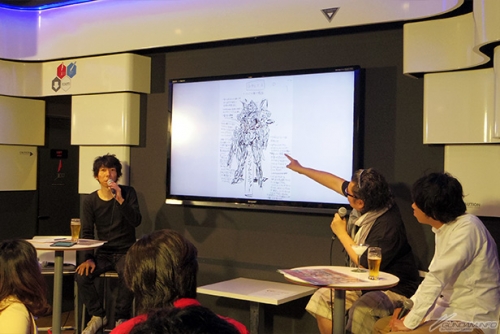 夜のG-レコ研究会は『ガンダム Gのレコンギスタ』の小形尚弘プロデューサーが、毎回ゲストともに様々なテーマで「G-レコ」を語るトークショーイベント。今回は同作のメカニカルデザインを務める安田 朗氏と形部一平氏の2人と、前回に引き続き撮影担当の脇 顯太朗氏がゲストとして登壇した。