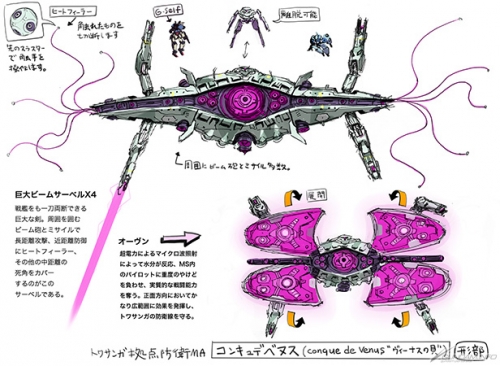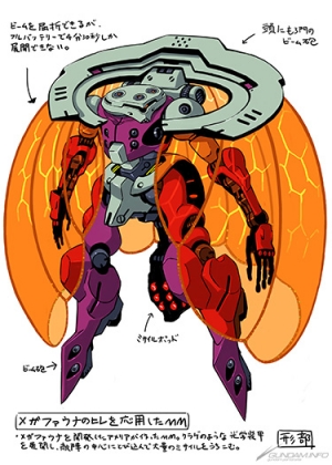 この“ヒレ”から技術転用されたものとしてデザインしたのが、特徴的な装備の「ビーム・マント」であり、本体については『水中用モビルスーツを宇宙に飛ばしたかった』という思いから、今のデザインになったと語る。