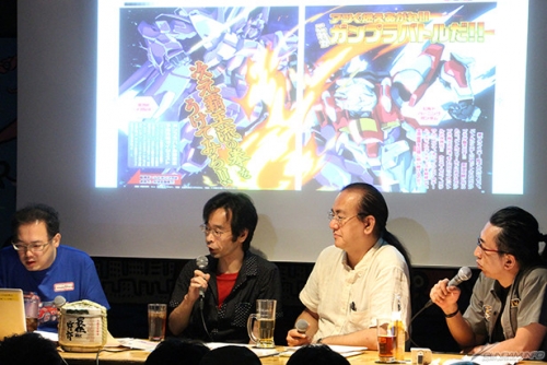 ▲第2部では、幸 ひさし氏(タカラトミー)と阿部宗孝氏(アニメーター)が、「マイトガイン」から『ガンダムビルドファイターズトライ』まで多彩な大河原メカの魅力を語った。