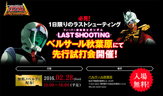全国のパチンコパーラーで3月22日(火)導入予定のSANKYOパチンコ新機種「フィーバー 機動戦士ガンダム ‐LAST SHOOTING‐」を、一足先に楽しむことができる先行試打会が、東京・ベルサール秋葉原にて2月28日(日)に開催されることが決定した。