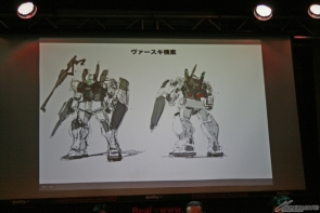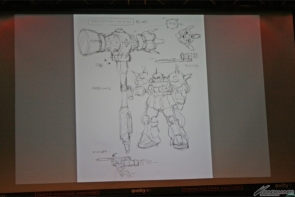続いて、第30話に登場するドズル・ザビ専用の「ザク」についての話題へ。既に一度登場しているので、財前氏から「サプライズ感が欲しいので、過剰に見えない程度の改造をするのはどうでしょう」と提案されてデザインを変更したとのことで、設定画も公開された。