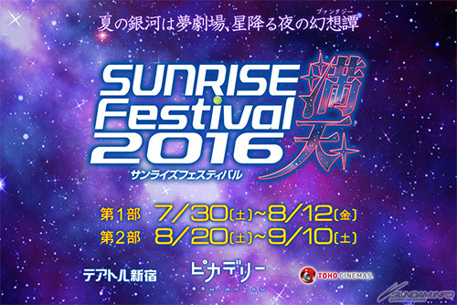 サンライズのアニメ作品を上映するイベント「サンライズフェスティバル2016満天」では、オールナイト上映作品のチケットが、明日7月3日(日)10:00よりイープラスにて一般販売される。価格は各回4,300円(税込)。