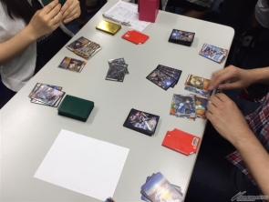 序盤から中盤にかけては両者とも互角だったが、9ターン目、タンテイさんが「BT03-063 ガンダムアストレイレッドフレーム(フライトユニット装備)」で「ガンダムナドレ」を打ち取り、うさうささんの母艦へ効果によるダメージを与えたことで、タンテイさんのデッキが動き始め、猛攻の火ぶたが切られる。