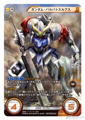 ▲「月刊ガンダムエース2016年11月号」の特別カード付録としてやガンプラ「HG 1/144 ガンダムバルバトスルプス」の購入キャンペーンで入手できるカード。後攻ならば【スクランブル】の効果で4ターン目にDEF7までのユニットを処理可能となる注目のカードだ。。