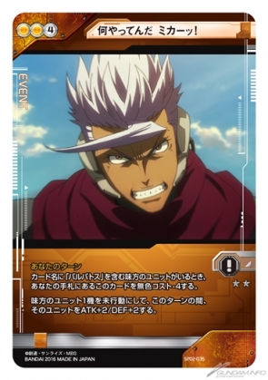 ▲ユニットを未行動にしつつ、ATKとDEFを2上昇させるイベントカード。カード名に「バルバトス」を含む味方のユニットがいれば無色コストが-4になり、コストパフォーマンスがとても良い。
