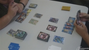 3ターン目、落とし神さんは「TR-4[ダンディライアン]」を出撃させ、カウンターを1枚伏せて終了。返しのターン、むるむるさんが出撃させたのは「SP02-031 グシオンリベイク」。「SP02-001 ガンタンク」と「TR-4[ダンディライアン]」の拘束を無視できるこのユニットを見たギャラリーから感嘆の声があがったが、攻撃を宣言した時にそれは驚きの声に変った。落とし神さんがオープンしたカウンターは「ガンダム鹵獲作戦」。その効果により「SP02-031 グシオンリベイク」は破壊。サイドボードから入れた対策カードがこれ以上ないタイミングで刺さったのだ。