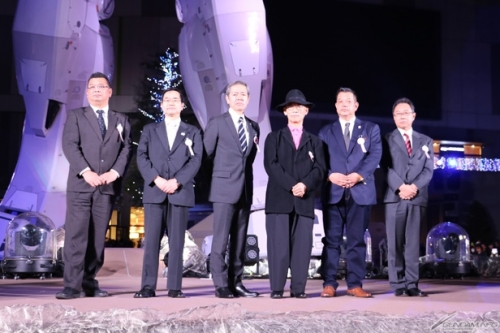 ▲左からダイバーシティ東京プラザ オペレーションセンター所長 上野山勉氏、TOKYO ガンダムプロジェクト2016実行委員会会長・東京港埠頭株式会社常務取締役 前田敏宣氏、株式会社バンダイナムコホールディングス 代表取締役社長 田口三昭氏、『機動戦士ガンダム』総監督 富野由悠季氏、株式会社サンライズ 代表取締役社長 宮河恭夫氏、株式会社創通 代表取締役副社長 出原隆史氏。