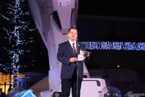 まずセレモニーでは、壁面のスクリーンに実物大ガンダム立像のこれまでの歴史を振り返る映像が映し出され、続いて各関係団体の代表者から挨拶が行われた。