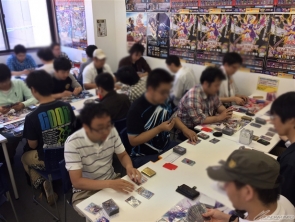 日本の中心に位置する名古屋は、今回のシリーズでも2回大会が開かれ、クロスウォー聖地と言ってもいいくらいの盛り上がりを見せている地域。6弾環境の最終仕上げとなるであろうこの大会の決勝に挑むのは、速攻緑単デッキ使いの「ヒロキ」さんと、黄色のソレスタルビーイングを中心に、黒のカードを組み込んだユニット回復デッキ使いの「マスダ」さん。