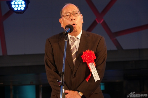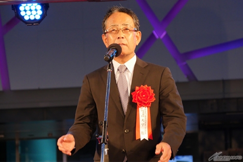 ▲セレモニーは来賓挨拶からスタート。歌舞伎町商店街振興組合の片桐理事長は、安心で明るく楽しい歌舞伎町になった、とオープンの喜びを語る。